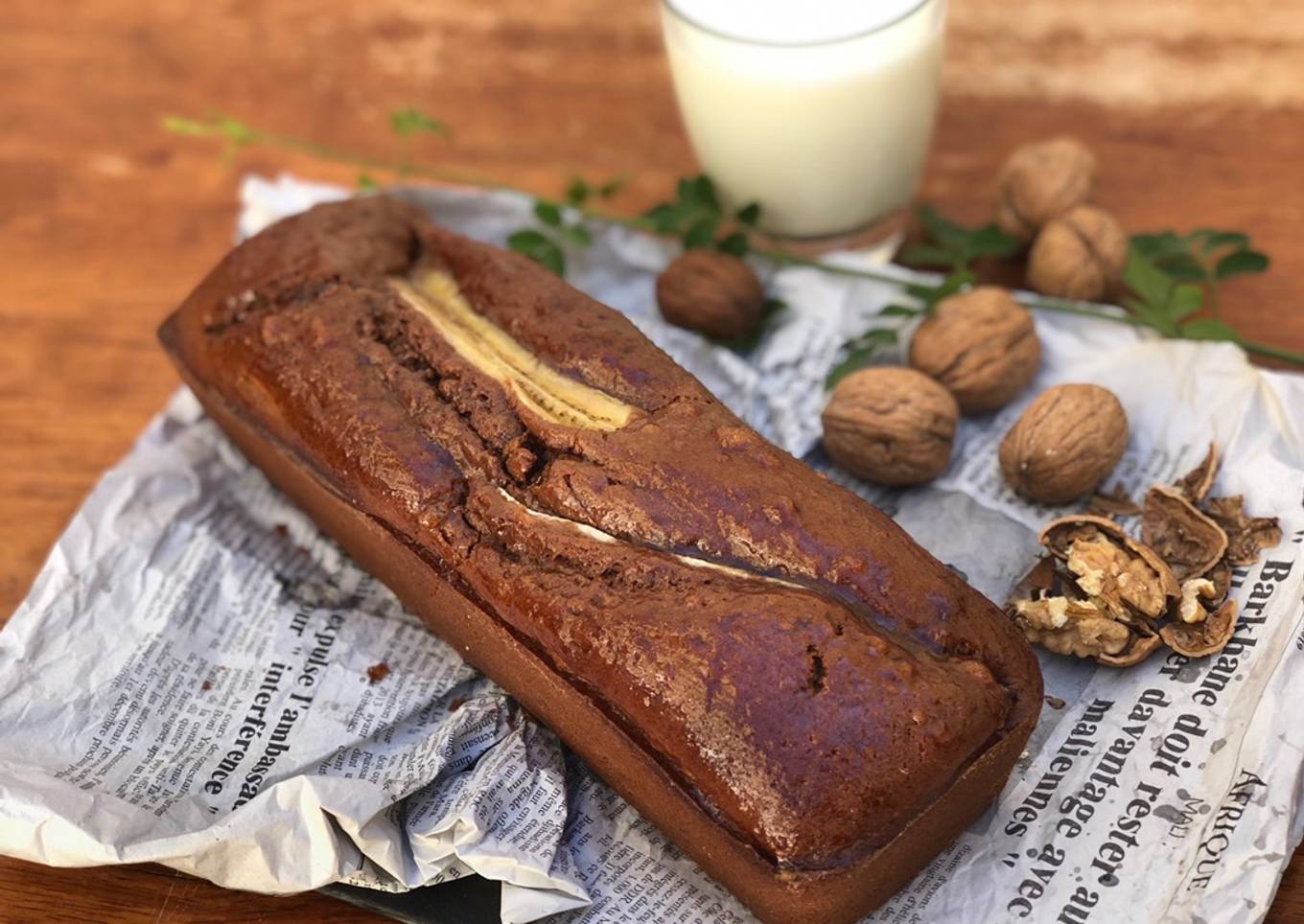 - 180 g sucre semoule 3 œufs 2 bananes mixée 160ml huile 160 ml lait 250 g farine 50g cacao non sucrée 50g noix concassées Levure chimique La garniture 1 banane