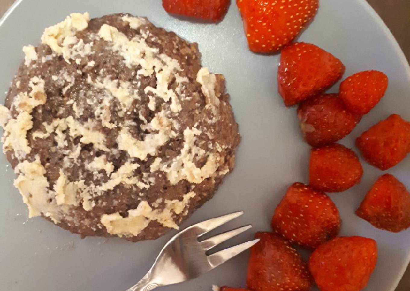 - Démouler dans une assiette, j'ai tartiné un peu de beurre cacahuète dessus et accompagné de fraise ;)