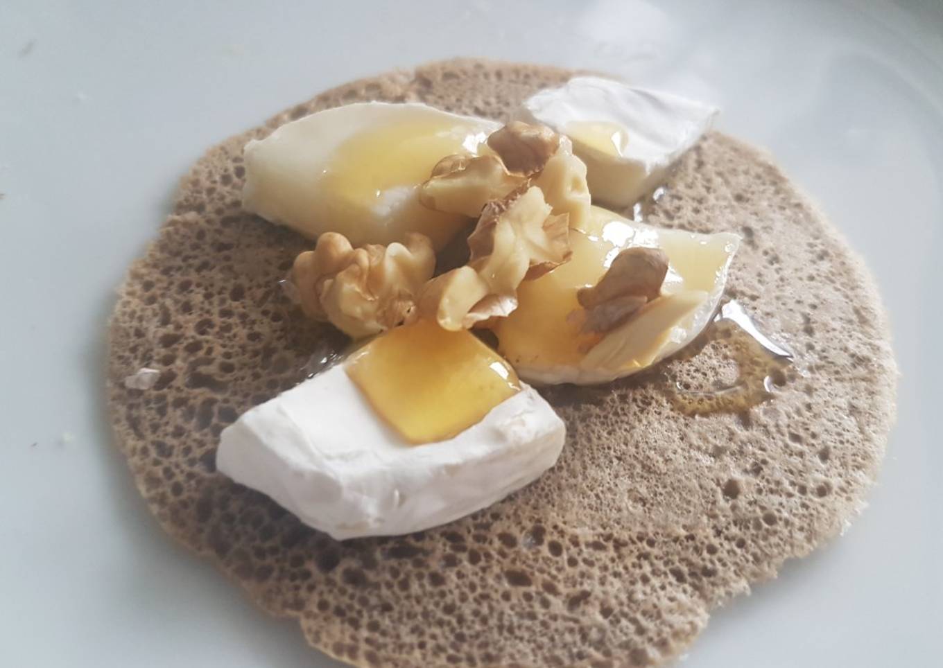 - Rajouter vos garnitures lorsque la deuxième face cuit. Sur la photo des morceaux de chèvre, du miel et des noix concassées.