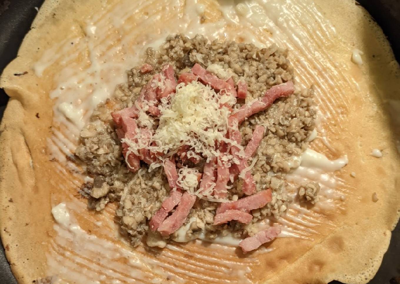 Cuire 1 côté de la pâte puis retourner la et mettre 1 cuillère à soupe de béchamel, les champignons, les lardons, du comté puis plier la crêpe en 2. À table !